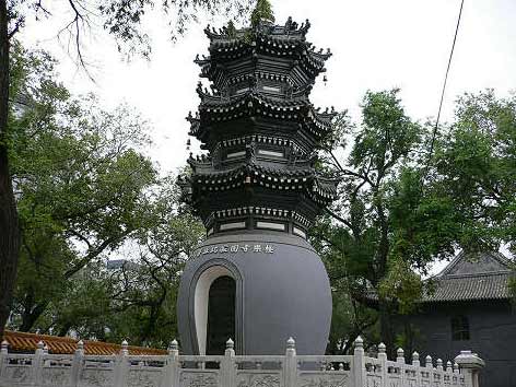 塔院内设灵堂,七级浮屠千塔和圆寂比丘塔,灵堂是一座欧式建筑,堂内供奉着一尊弥勒佛像、一尊十一面观音菩萨像和一幅五百罗汉像画。真是绝妙的中西合璧。