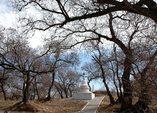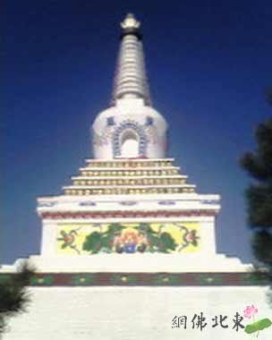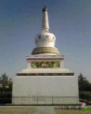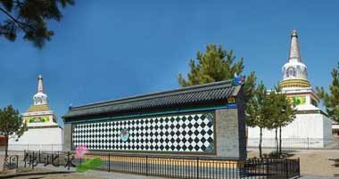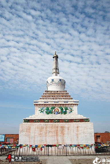 台座上方是覆钵形白色塔身,高约四米,上有八个独角兽,嘴里各衔彩色璎珞。塔身南面各设一个佛龛,东塔龛门四周刻有双龙飞舞,西塔龛门四周为花草环绕。据说,这两个佛龛内各藏有本塔铜制镏金模型,高约一尺有余,小巧玲珑,工艺精湛。解放初,被本寺一喇嘛登塔盗走。