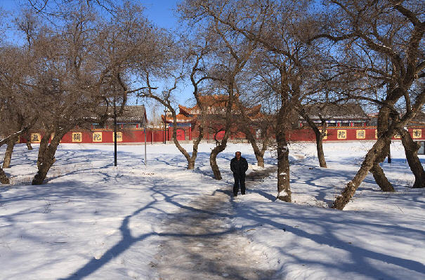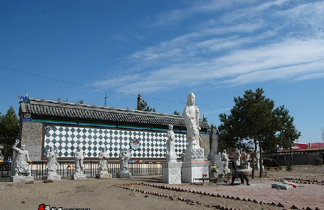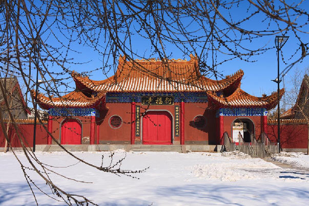 衍福寺始建于清初,康熙二十三年(一六八四)扩建,庙名为“都布度贵扎尔拉古鲁克奇”,汉译为“广福寺”,后改译为“衍福寺”,俗称“金寺”。由三组建筑群组成。主体建筑群居中,最南面是正门影壁,其后依次是双塔。山门殿、钟鼓楼、左右侧殿,大殿(经堂)、东西藏经楼,直至后殿。据传说,寺内最繁盛时有喇嘛三百余人。每年农历六月十五日,为本寺经会日,届时,寺内举行盛大仪式。跳查玛舞(俗称跳鬼,祭敖包、赛马、摔跤、射箭、打布鲁,向观众施舍肉粥),热闹非凡。可惜的是,在解放后,当地民众捣毁佛像,将其改做粮库。后经一场大火,烧毁了全部殿堂。山门前的双塔和影壁均为青砖砌筑,火不能燃,得以幸免,保留至今。