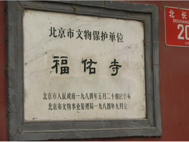 北京福佑寺 市级文物保护单位。位于西城区北长街。建于清顺治年间,为清圣祖玄烨的避痘处。雍正元年(1723)拟分给宝亲王(乾隆帝)弘历作为私第。弘历未迁入,登基后改为喇嘛庙,名福佑寺。后代曾数次重修。寺坐北朝南,外垣门西向。全寺共为三进。第一进由山门、钟鼓楼、天王殿组成。山门面阔三间,黄琉璃瓦歇山顶。山门前后建造有雕龙御路,左右建八字屏墙,门正南面建有巨型琉璃照壁,长18余米。门前东西两侧矗立有木牌楼2座。主建筑天王殿为黄琉璃瓦歇山顶,殿前东西建有钟鼓楼,为黄琉璃瓦重檐歇山顶。第二进殿中大雄宝殿为寺的中心建筑,面阔五间,黄琉璃瓦歇山顶,正脊中部建有莲花座铜塔。第三进为后殿,面阔五间,歇山顶。殿内供奉“圣祖仁皇帝大成功德碑”牌位。大雄宝殿5间,前有月台,雕云纹御路。后殿5间,内供奉“圣祖仁皇帝大成功德佛”牌位。主殿的两侧均建有配殿、配房等。1919年毛泽东率领湖南驱逐军阀张敬尧的代表团来北平时曾在此暂住。1927年改为西藏班禅驻北平办事处。1949年后曾为西藏班禅驻京办事处。1984年建中国民族博物馆,收藏与民族文化有关的文献、影视、民族文物等资料。同年,被公布为划定保护范围及建设控制地带,保护范围包括班禅驻京办事处的使用范围,东至筒子河,南、北至寺墙,西至规划红线。