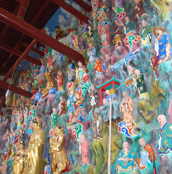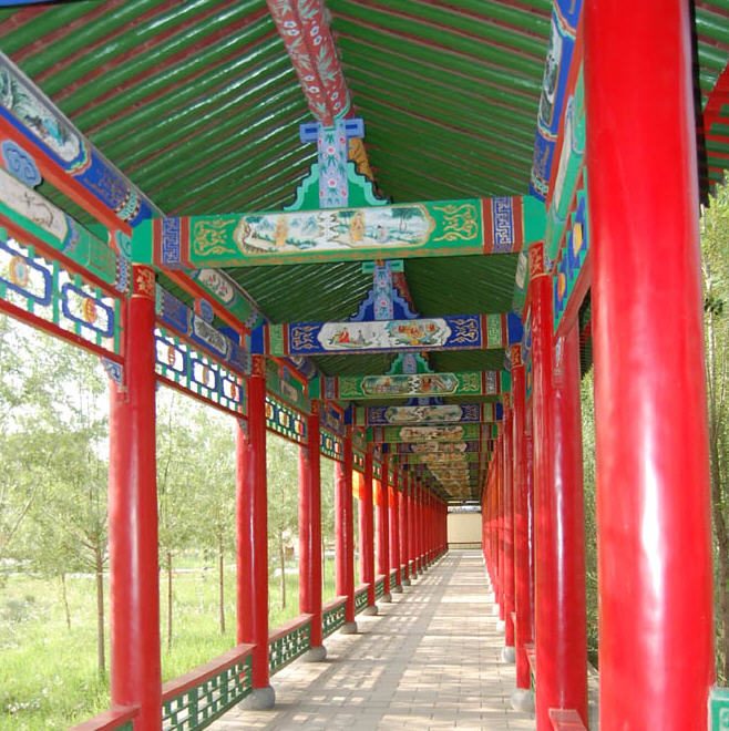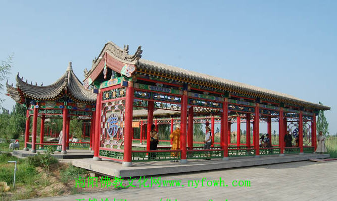 佛教文化长廊位于广场两侧。东廊长一百四十五米,廊顶绘有释迦牟尼佛从入胎、降生、出家、修道、转法轮、度众生、成佛及涅槃一生的故事;西廊长七十六米,廊顶绘有观世音菩萨三十二种神通变化等神妙典故。东侧中间大厅供奉有释迦牟尼佛灵山会上说法之石雕塑像,手结拈花印,示大乘教,度有缘人。