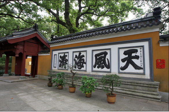 沿牌坊后石阶上攀,于尽处有山门高筑,古朴无奇。过山门,有一照壁与天王殿两两相对,壁刻“天风海涛”四字,笔力苍劲,有风摇枯枝之感,兼涛卷金沙之势,为长宁梁叔子书。