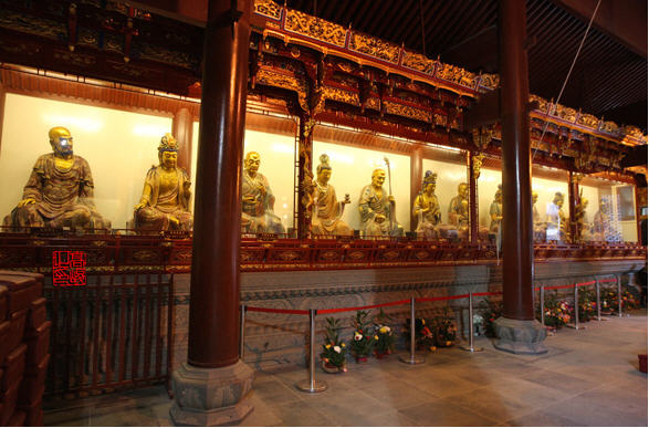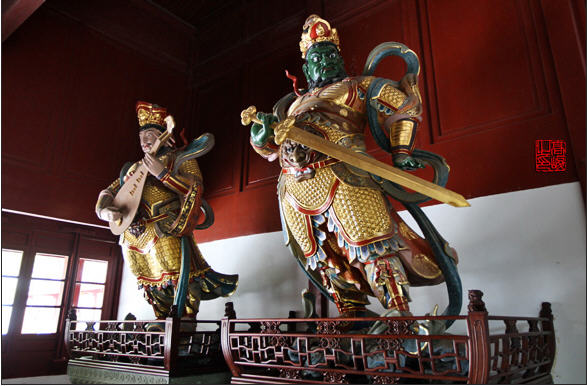 天王殿额题“香海萦洄”,意为“香水海有清净德”。殿前左右蹲倨则非石狮,而是瑞兽麒麟。其与凤、龟、龙合称四灵,亦称圣兽王。殿内迎面奉弥勒,背后供韦驮。左右两壁塑四大天王像,握宝剑的南方增长天王,表示风,因其宝剑无鞘,所以又叫剑无鞘;持琵琶的东方持国天王,表示调,因其琵琶无弦,所以又叫琴无弦;持宝伞的北方多闻天王,表示雨,因其宝伞无骨,所以又叫伞无骨;握蟠龙的西方广目天王,表示顺,因其蟠龙无鳞,所以又叫龙无鳞。合之则为“风调雨顺”四字,隐寓“国泰民安”之意。天王殿左为客堂,专司接待之职。真可谓:朝暮二时,喜迎十方众菩萨;禅净两道,广度四海诸有情。