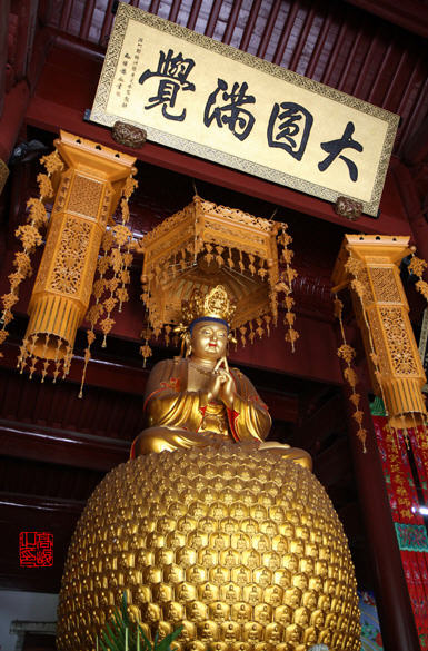 过了天王殿,左右有抄手回廊与“普光明殿”左右相连,“普光明殿”系双泉庵主殿,殿中供奉有毗卢庶那佛跏跌坐像,头顶毗卢宝冠,手结如来密印,庄严殊胜。毗卢庶那佛即世尊释迦牟尼法身,和世尊报身卢舍那佛、应身释迦牟尼佛合称如来三身。座下莲台与众不同,共有花瓣千朵,称千叶宝莲。莲瓣每叶均有如来法像,故此尊佛像有一名号,称千佛绕毗卢。为经中所云“一花一世界,一叶一如来”句之变相。为普陀佛像一绝。