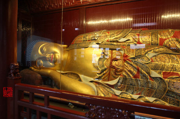 其背供世尊涅槃像。左右两壁塑有华藏世界海诸大菩萨像,即东方观察胜法莲华幢菩萨、南方普照法海慧菩萨,西方月光香焰普庄严菩萨、北方师子奋迅光明菩萨、东北方最胜光明灯无尽功德藏菩萨、东南方慧灯普明菩萨、西南方普华光焰髻菩萨、西北方无尽光摩尼王菩萨、下方法界光焰慧菩萨、上方无碍力精进慧菩萨。华藏世界海又作莲华藏庄严世界海,为毗卢遮那佛于因地修菩萨行时所成就之清净庄严世界。