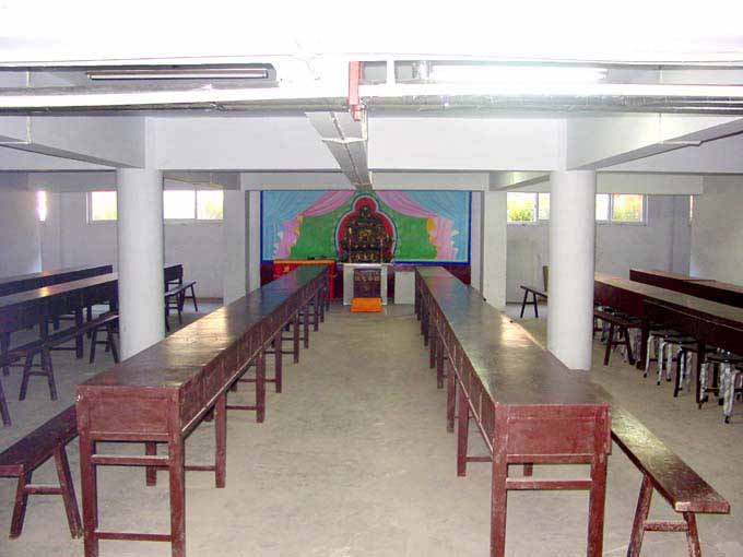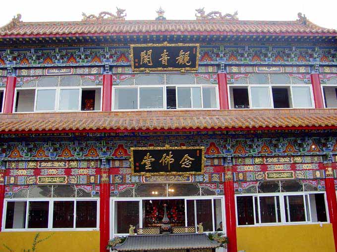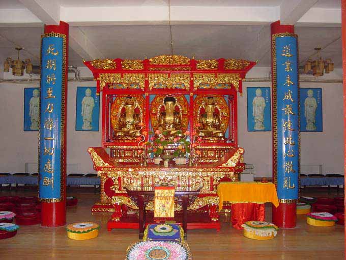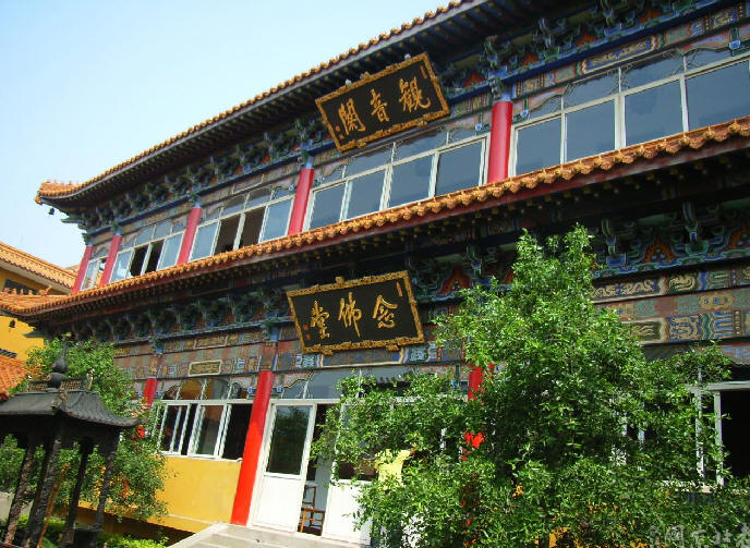 后殿共三层,地下室为斋堂,可纳数百人用餐。一楼为念佛堂,大殿供奉阿弥陀佛、观世音菩萨、大势至菩萨像,阿弥陀佛为西方极乐世界之教主,观世音、大势至二菩萨为阿弥陀佛之胁侍,辅助阿弥陀佛教化众生,此一佛二菩萨,世称西方三圣,三圣像身皆金色,庄严无比!大殿后有药师殿和地藏殿。分别供奉药师三圣和地藏菩萨。二楼观音阁,供奉千手千眼观世音菩萨,《楞严经》云:“观世音菩萨,以修证圆通。无上道故。能现众多妙容,由一首三首乃至一百八首,千首,万首,八万四千烁迦罗首。由二臂四臂乃至一百八臂,千臂,万臂,八万四千母陀罗臂。由二目三目乃至一百八目,千目,万目,八万四千清净宝目”。千手观音庄严殊圣,见者莫不恭敬赞叹!念佛楼内彩绘辉煌,周围的墙壁上绘有观世音菩萨普门品和二十四 孝全图,寺内所见无不使人生善,皈心正教!