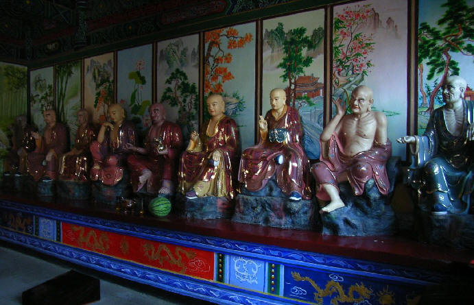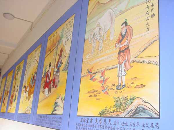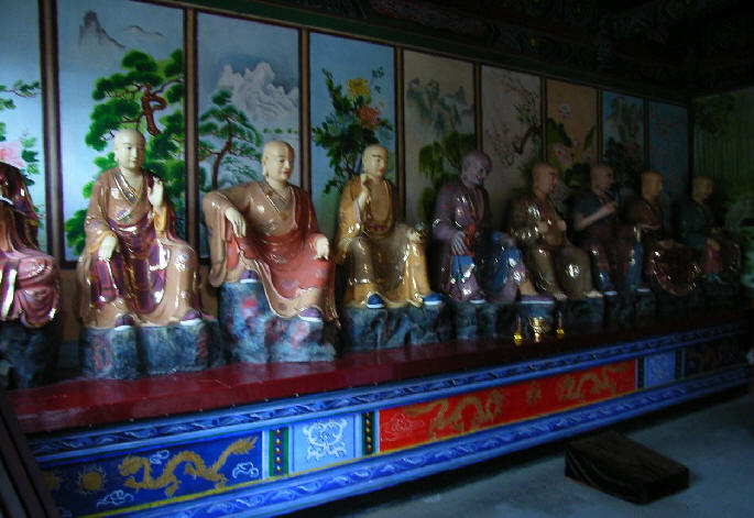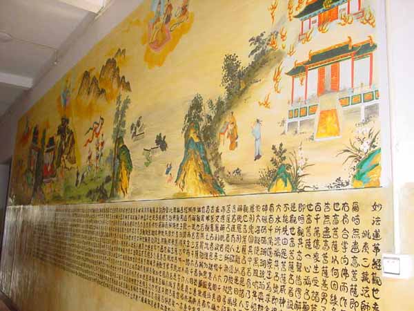 大雄宝殿的两侧走廊,彩绘鲜艳,墙壁上嵌有大理石三十三观音像:杨柳观音、龙头观音、持经观音、圆光观音、游戏观音、白衣观音、莲卧观音、泷见观音、施药观音、鱼篮观音、德王观音、水月观音、一叶观音、青颈观音、威德观音、延命观音、众宝观音、岩户观音、能静观音、阿耨观音、阿么提观音、叶衣观音、琉璃观音、多罗尊观音、蛤蜊观音、六时观音、普慈观音、马郎妇观音、合掌观音、一如观音、不二观音、持莲观音、洒水观音,形象慈悲庄严,各有寓意!