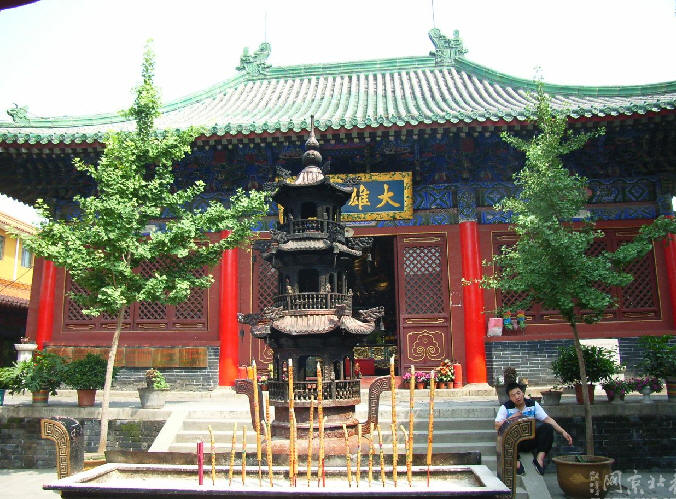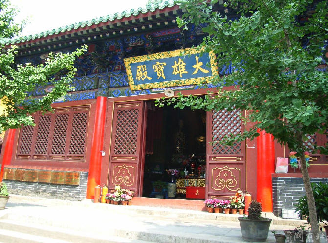 寺的正中为大雄宝殿,大殿建于高一米的砖砌台阶上,面宽三间,覆绿琉璃剪边四坡砌菱形绿琉璃的庑殿顶,殿内正中为释迦牟尼佛和迦叶、阿难两大弟子像,殿内两侧为十八罗汉像。大殿外檐油漆彩画清净庄严,十八罗汉、文殊、普贤、释迦如来及弟子像栩栩如生!