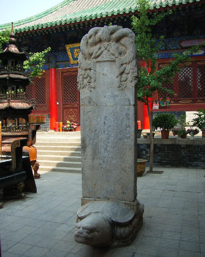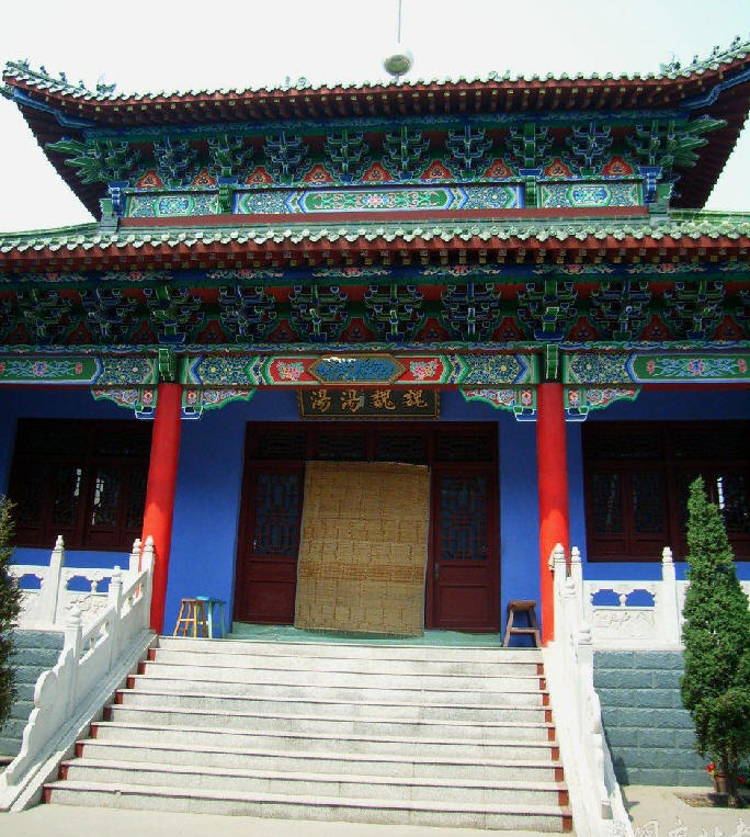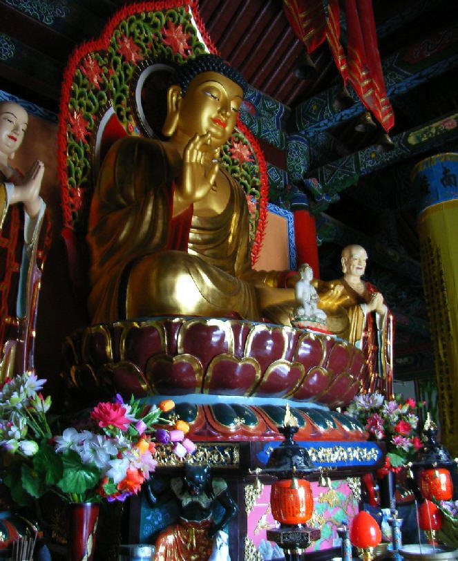 山门前有一座九龙壁,上雕有九条神龙,形态颜色各个不同,鲜活如真。寺前有门殿,左右有钟鼓楼,中有大雄宝殿,后有念佛楼。寺的正门是一座三间绿琉璃剪边歇山顶的门殿,因殿内塑天王像,又称天王殿。殿内正中为弥勒菩萨,是继释迦牟尼佛之后将要在此世界成佛的菩萨,所以又被称为弥勒尊佛。本寺山门所供奉的弥勒菩萨与常见的笑弥勒略有不同,此尊弥勒菩萨头戴天冠,全身金色,庄严无比!殿内两侧为四大天王,即东方持国天王,名叫多罗吒,谓能护持国土,持琵琶;南方增长天王,名毗琉璃,谓能令他善根增长,持剑;西方广目天王,名毗琉博叉,谓能以净天眼,常观拥护此阎浮提,持火龙;北方多闻天王,名毗沙门,谓福德之名闻四方,持伞。弥勒像背后为韦陀菩萨像,因常于东西南三洲巡游,守护佛法,世称韦驮菩萨。
