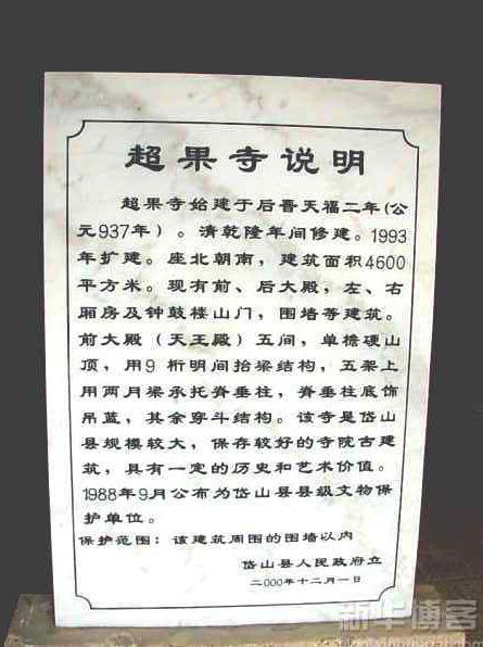 “超果”,佛教用语,意为世人超脱凡间后成正果。民国《岱山镇志.艺文.超果寺记》载:宋朝时,岱山岛上超果寺已是“岛中 最称胜者,基宇广延,肇造宏丽,松竹环山,莲池绕宇,觅景寻幽者,莫不于此流连称赏不置。”到了明朝时,倭寇侵扰岱山,超果 寺成一荒址。清康熙年间,僧自修来岱山募资重建此寺,“将大殿 两廊以及寮舍、斋厨修饰一新,且更添建山门,装塑金刚,将数百年之超果,又多增辉于今日矣”。