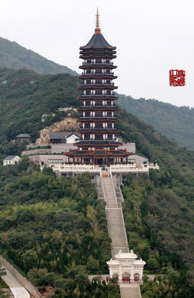万佛宝塔由已故的妙善法师发起兴建,该塔全名为“普门万佛宝塔”,因其内奉九种造形的观音菩萨鎏金铜像壹万尊而得名。万佛宝塔工程于2002年破土动工,宝塔背靠佛顶山主峰,采用八角重檐楼阁式,蓝琉璃瓦攒尖顶,塔分九层十三檐,含塔刹总高72.26米,为目前浙江省最高佛塔。
