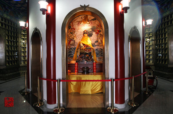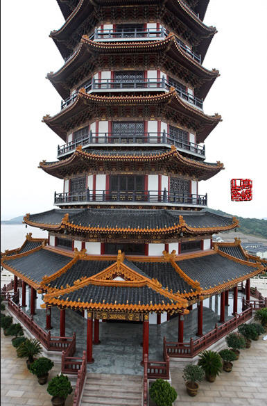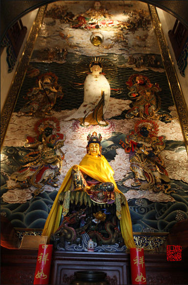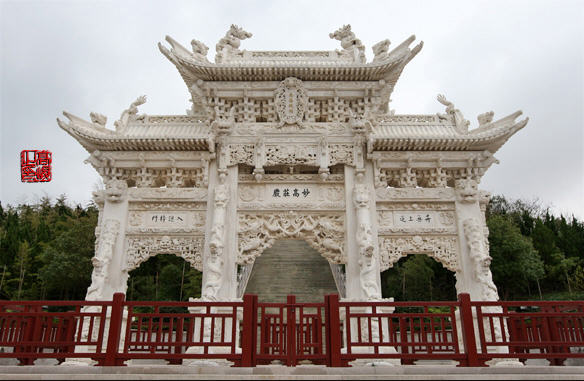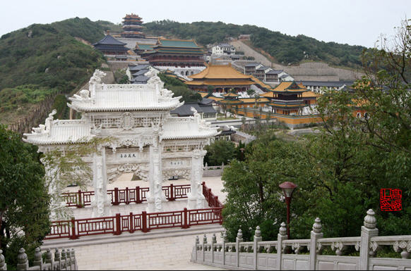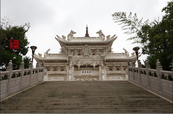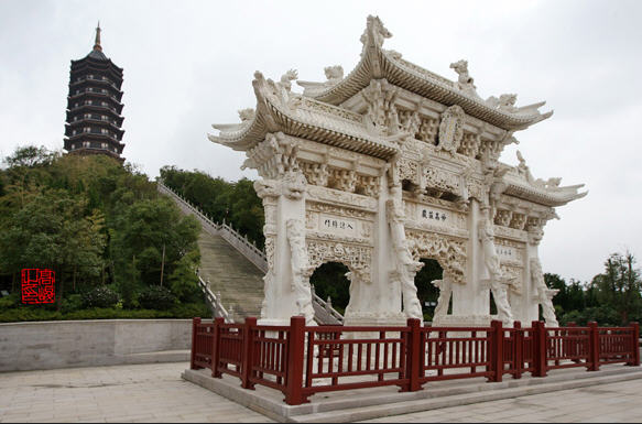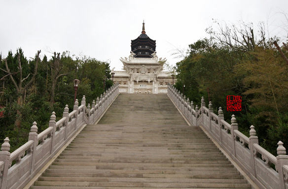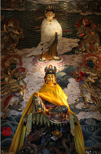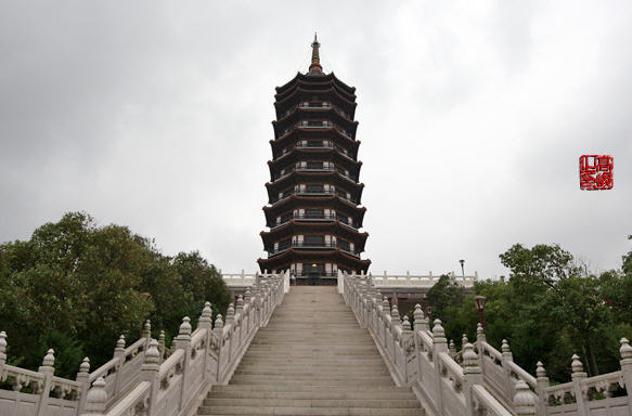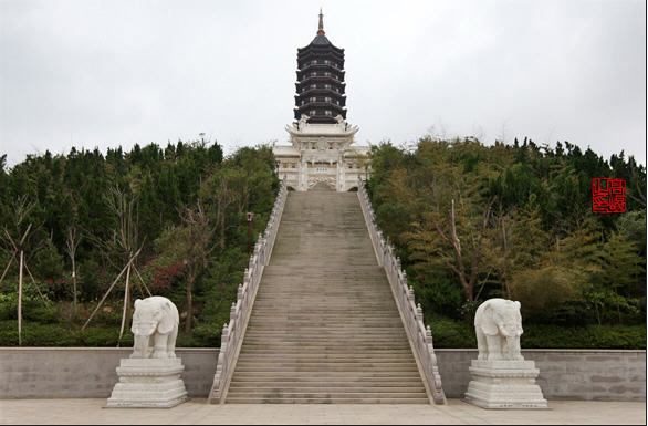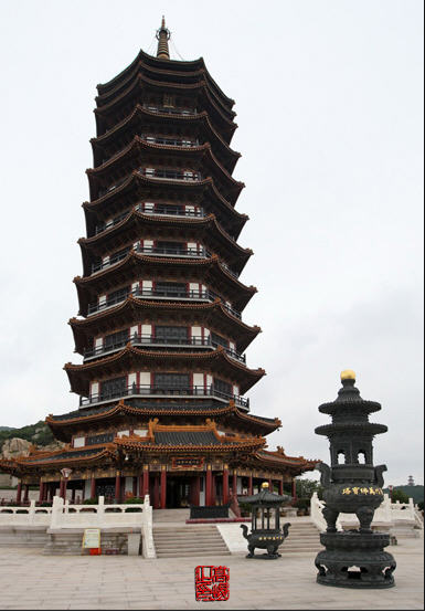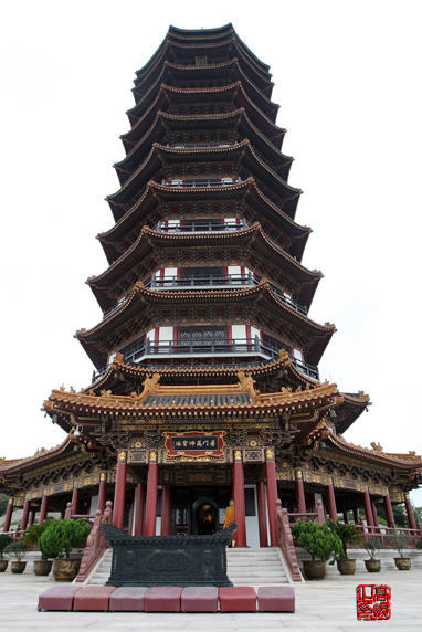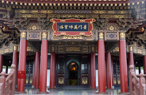 普门万佛宝塔采用清式仿木结构宝塔形式,内供十种造型各异观音宝像一万尊。一层供毗卢观音1547尊:夹层供水月观音1176尊:二层供自在观音1176尊:三层供圆光观音1127尊:四层供骑龙观音1127尊:五层供净瓶观音973尊:六层供听潮观音805尊;七层供合掌观音805尊;八层供岩户观音630尊;九层供如意观音625尊。九层之势,以符“至尊”之意,堪称“世纪精品,人间一绝”。