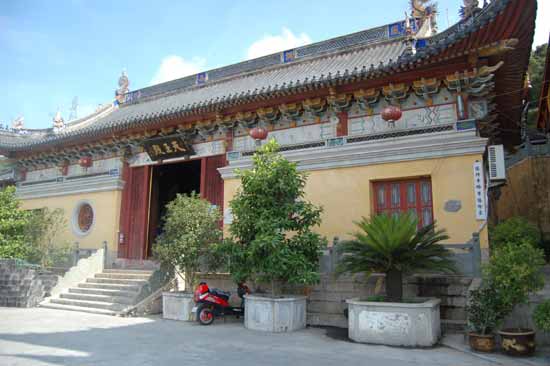 接待寺,始建于明成化元年(1465年)原址位于普陀区沈家门镇天打岩西山腰上。民国十九年,因山匪搔扰,按原样迁至沈家门镇天打山嘴。1982年,大殿和东配殿被毁.1991年,僧证印募资重修;1994年全寺又作了较大规模的修建.该寺座北朝南,现在大雄宝殿、东西厢房、地藏殿、三圣殿等建筑。大雄宝殿,面阔三间12.60米,通进深13.60米,明间五架梁前廊后三步,其余穿斗式,用桁9根,明、次间各6扇六枺菱形花格门,单檐硬山顶,正脊设吻兽,中间饰连球,屋面盖小青瓦。占地面积约1100平方米。