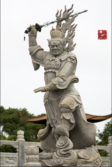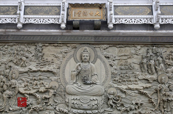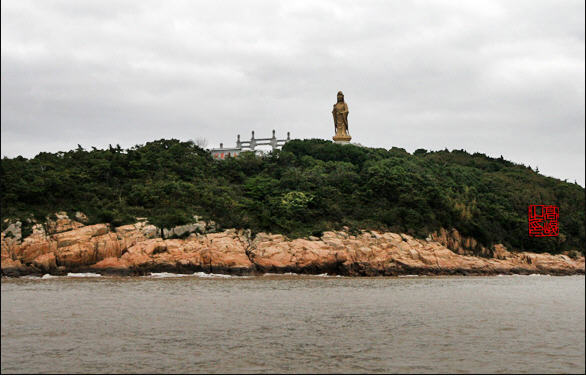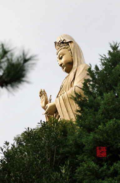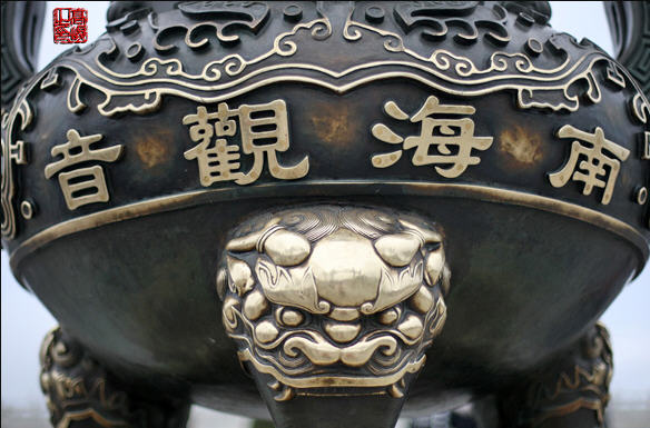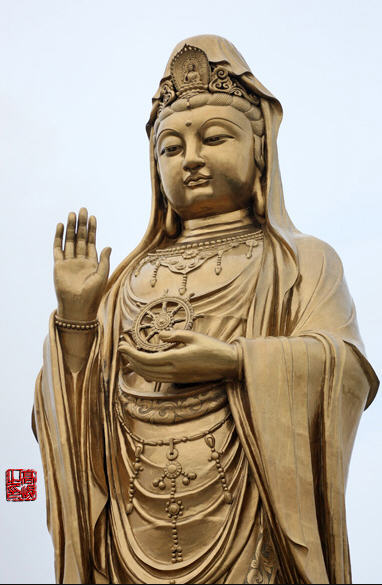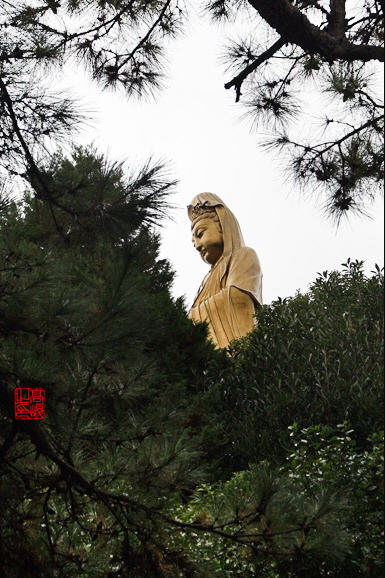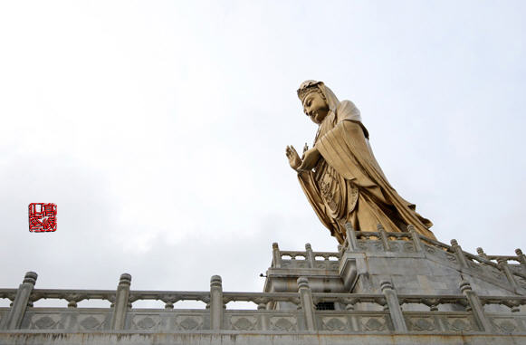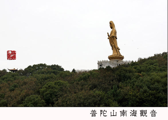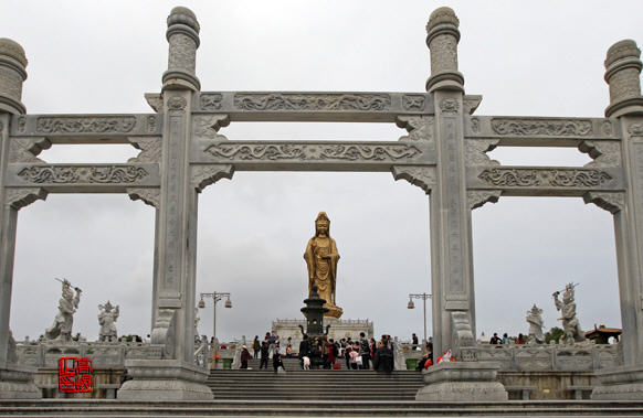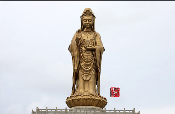 观音菩萨仿金铜像高20米,主钢架总高度19.4米,面部含金量6.5公斤,造价1500万。左手托**右手施无谓印,双目垂视,眉如新月,大慈大悲,神韵尽出。铜像地处观音眺、南天门之间,面朝大海,与洛迦山隔海相望。整个工程设计充分体现了海、山和铜像三者的高度和谐统一,宝像造型则尽现了观音菩萨的慈、悲与柔美,形像端庄,线条流畅,金光闪闪,无将以海天佛国宗教艺术的一大瑰宝被载入史册。中国佛教协会会长赵朴初居士欣喜的为“南海观音”提笔题字。