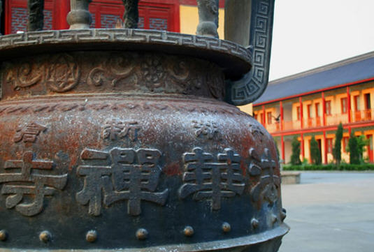 大雄宝殿双层重檐斗拱式建筑,雄壮宽广,有落地长窗,中间供如来佛,两旁为十八罗汉。殿前中间伫立巨型宝鼎一座,香烟缭绕,四季不断。每逢佛事活动和诵经时分,钟鼓齐鸣。