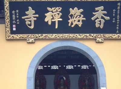 现重建中的香海寺,规划占地面积约92144 M2,总建筑面积约21333 M2。建筑拟采用清式南方寺庙建筑形式,墙体、梁柱、门窗为佛庙传统颜色,黑色或黄色琉璃瓦屋面、石台基和护栏。主要寺院建筑的层面分别采用庑殿顶、歇山顶、重檐歇山、十字顶等多种形式,为求统一中有变化。