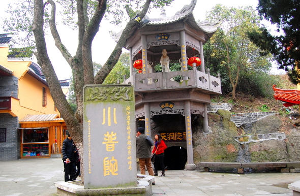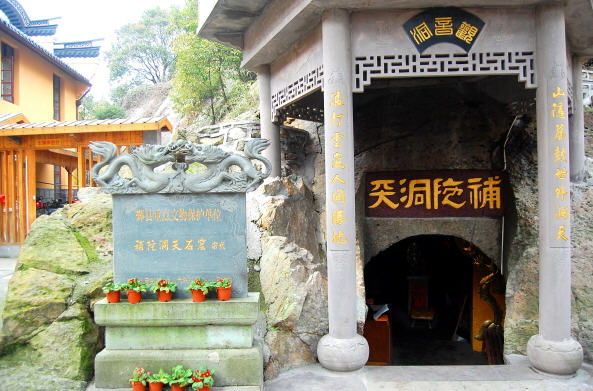 霞屿寺就在东钱湖西北,与月波山相峙。1976年有人在霞屿岛发现了一个南宋时所凿石洞,长41.40米,高4米,洞口修有“补陀洞天”四字,与清初高宇泰《敬上绿》记载基本相符。据志载,霞屿寺初建于北宋,始建者为孙史岩,在此凿山为观音洞,名曰“补陀洞天”。又在洞旁建寺,名“霞屿寺”,并割田以赠。因洞在霞屿岛上,进香者需以舟渡湖,又洞仿普陀观音道场供奉观世音,故有“小普陀”之称。明洪武十九年(1386年)寺废,永乐二十年(1422年)修复,宣德八年(1433年)再次重建。李堂有《游补陀洞天》绝句:“相公囊括宋山河,凿石穿云作补陀。若见崖山还好境,慈元宫殿碧嵯峨。”寺清朝寺废,补陀洞天渐被浸没,1976年,为整治东钱湖而建湖心塘,补陀洞天重新被发掘,进香者纷至沓来,1989年平3月,经批准开放,由此丘尼管理,并将重新建造殿堂,补陀洞天石窟中有依石而雕刻的观音坐像一尊,右壁镌昂首曲身游龙,左壁为浮雕韦驮立像。自1986年开始,政府拔款投资,先后于1986、1995、1998年连续三次对寺院进行修整和重建,寺院现在圆通殿、天王殿、伽蓝殿等佛教基本建筑,现存重要文物有石刻观音一尊。北宋年代的石龙是该寺镇山之宝。由于霞屿寺地处东钱湖风景胜地,因而香火口兴、佛风日盛。元朝诗人袁士元就有诗赞曰:“ 说西湖足胜游,东湖谁信更清幽。一百五十客舟过,七十二溪春水流。白鸟影边霞屿寺,翠微深处月波楼。天然景物谁能状,千古诗人咏不休!“