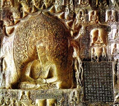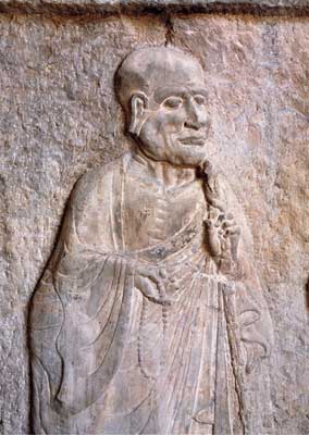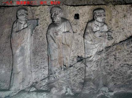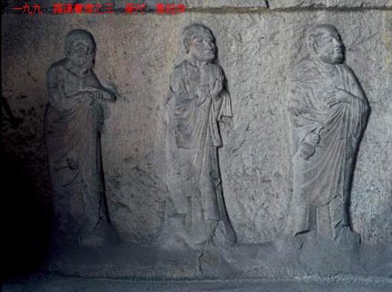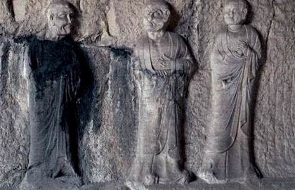 看经寺在龙门东山万佛沟北侧,为东山最大的洞窟。是武则天为唐高宗开凿的。洞的正面有一座建于清代的砖瓦结构二层楼,门额上刻着“看经寺”三字。洞顶雕有莲花藻井,周围环绕着四个体态丰润、形象优美的飞天。洞内东、南、北三壁在高1.2米的台基上浮雕二十九尊罗汉像,身高在1.80米左右,均有残毁,相传是从摩诃迦叶到菩提达摩二十九位西土“祖师”的形象,神态刻划细致入微,既统一又富于变化,生动有致,栩栩如生,是龙门石雕罗汉群像中的杰作。