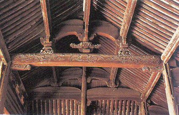 该寺坐西朝东,东西长60米,南北宽30米,总体布局呈长方形,中轴线上有山门、大雄宝殿、藏经楼及偏殿。山门三开间,左右偏殿各四间,外观为硬山顶,梁架为穿斗式,通面宽26米,进深8米。大雄宝殿为单檐硬山顶建筑,五开间,面宽18米,进深12.5米。明间为抬梁式,次间抬梁穿斗式,抬梁上有浅浮雕,中置雄鹰雕刻,两边饰云纹图案,四周有回廊,柱础为鼓形。藏经楼亦为硬山顶,面宽18米,进深11米。