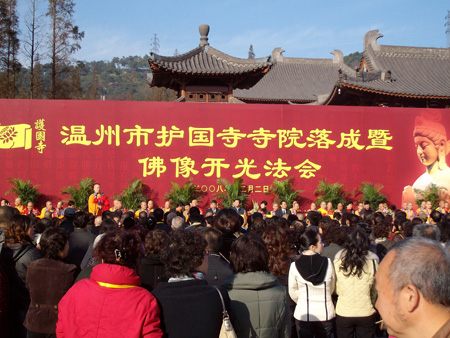 历时5年重建的我市护国寺举行了庄严的落成开光庆典。浙江省民宗委副主任陈智慧,市委常委、统战部长余梅生、市人大副主任王小同、副市长陈宏峰、市政协副主席姜嘉锋等出席仪式。中国佛教协会副会长、省佛教协会会长戒忍大和尚及来自全国各地的佛教界人士、本市佛教界信众代表3500多人应邀参加了庆典活动。