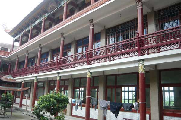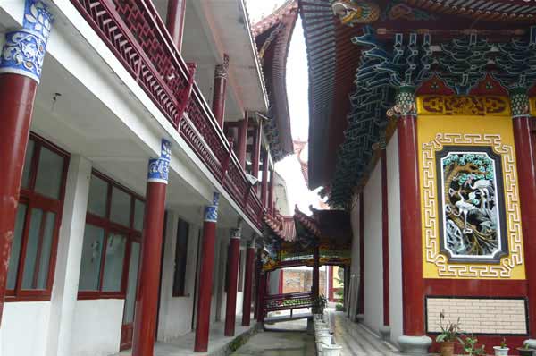 整座寺院包圍在一帶黃牆之中,古宮庑殿式的寺宇建築鬥拱飛檐、紅瓦耀目,顯得高大挺拔、氣派非凡。新建的七間三層樓房之“五聖殿”尤爲雄偉壯觀。下層是夥房和齋堂,中層是僧房,上層統稱“文殊閣”,因爲寺名“吉祥”,而文殊菩薩又稱妙吉祥菩薩,故以菩薩之名号冠之爲“文殊閣”。中間座有藏傳黃身文殊菩薩之銅像,東邊有金剛薩陲菩薩和穢迹金剛,西邊觀音閣座千手觀音和三官大帝。寺宇結構錯落有緻,金碧輝煌,禅林氣氛莊嚴肅穆。看燭屋寶鼎内香煙缥缈,過道天井中花木成蔭;聽誦經念佛法音陣陣,木魚鍾磬伴節聲聲,給人以清新之感,由然而生敬仰之情。