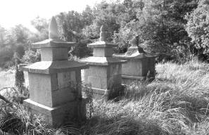 墓塔 跨过碧泉寺大雄宝殿的右侧大门,沿山路台阶而上,约5分钟行程便来到新发现的这组墓塔所在地。这里环境幽雅、视野开阔,给人豁然开朗的感觉,其选址精妙之处可见一斑。墓塔位于海拔354米的草地上,背靠山脉自东南至西北依次分布,与此前发现的两组墓塔位置形成一个三角关系。墓塔共3座,由塔基、塔身和塔顶构成。每座高约2.8米,相隔间距约1.18米。塔身由花岗岩条石纵横合榫而成,上用单块花岗岩石板做成单檐四角攒尖顶,其中一塔的宝顶为仰莲。其余两座为重檐,宝瓶状攒尖顶。中间一塔前竖一青石碑,上刻“清道光戊戌年十月初五日,皇清傅临济壬宗第四十二世上道下德印和尚之墓”。落款文字模糊不清难以辨认。东南侧墓塔塔身上阳刻“寂灭为乐”四字。每座墓塔背立面做有一个可以开启的石质正方格。另外,右侧建有一座小型青石质的墓塔,估计建于近现代。