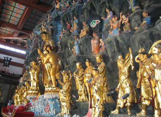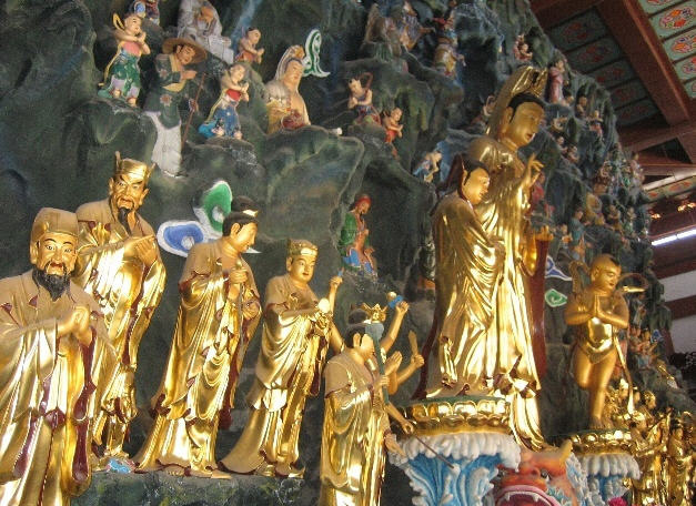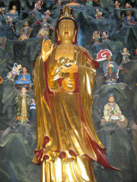 “海岛观音”,俗称"望海观音"。观音是大乘佛教中的四大菩萨之一。她以传说海里的鳖为坐骑。"海岛观音"这组彩塑像有大小群像中心人物是赤着双脚,立在鳌头上的观音,好手持杨枝净水瓶,内装神厅的甘露水,用以救人百病,表现出"普渡众生"的风范。其左边侍立着双手捧有宝珠的龙女,右边有向观音合十参拜的善财童子。本庙海岛观音群雕,主要讲述善财童子五十三参的故事。善财童子最初,从文殊菩萨处发菩提心,次第南行,先后向菩萨、佛母、比丘、比丘尼、优婆塞、长者等,五十三位善知识参访请教,最终获证善果。故事在民间广为流传,善财童子成了虚心求法,广学多闻的典范。俗语“五十三参”, 比喻虚心求教,不辞辛苦,就是典出于此。