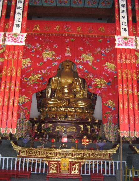 “大雄宝殿”是供奉佛教缔造者和最高领导者的地方。“大雄”是对释迦牟尼佛的尊称,具体指的是佛像大勇士 那样神通广大,法力无边。能伏“五阴魔”“烦恼魔”“死魔”“天子魔”等四魔。本寺“大雄宝殿”供奉的主要佛像为“横三世佛”这里的“世”指三个空间世界。以其同时存在,故名“横三世”正中为娑婆世界的教主释迦牟尼佛。左侧为东方琉璃世界的教主药师佛。右侧为西方极乐世界的教主阿弥陀佛。