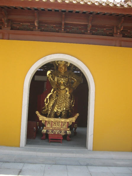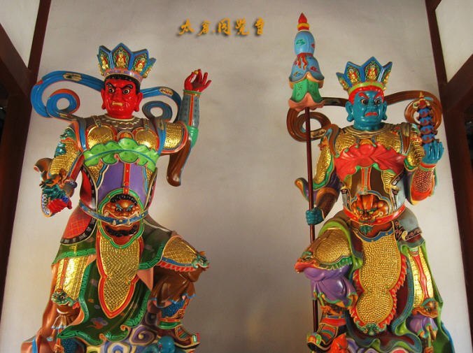 “山门殿”供奉的是胖墩墩,笑嘻嘻,袒露大肚皮,无忧无虑,笑迎八方来客的弥勒菩萨:弥勒菩萨也是释迦牟尼佛的接班人,但要等释迦佛寂灭后五十六亿七千万年后,才降临人间,正式成为弥勒佛,在龙华树下说法三会,度尽一切众生。与弥勒菩萨背靠背,面朝天王殿的是韦驮菩萨,他是佛寺的守护神,也保护着佛法不受危害。塑韦驮菩萨的姿势主要有两种:一种是双腿直立,双手合十,两腕横一降魔杵。据说,将韦驮塑成这一姿势的寺庙允许云游僧人挂单;另一种为左手握杵拄地,右手叉腰,看上去气势不凡,威风凛凛。据说,将韦驮塑成这一姿势的寺庙是谢绝游方僧人挂单的。