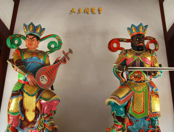 “天王殿”的左右两侧供奉的就是人人皆知的四大天王 他们本是古印度神话中的神。佛教认为,世界以须弥山为中心,四周是大海,海的四面各有一洲,分别由一位天王率夜叉大将镇守佛国一方,这四大天王是:东方持国天王,名提多罗叱,南方增长天王,名毗琉璃,西方广目天王,名毗琉国叉,北方多闻天王,名毗沙门,四大天王手持的法器,各有象征寓意:南方增长天王手持宝剑,象征"风";东方持国天王手持 琵琶,象征"调";北方多闻天王手持一伞,象征"雨";西方广目天王手持一条蛇,象征"顺"。合起来,就是"风调雨顺",象征着五谷丰登。所以四大天王看上去似乎个个面目狰狞,其实却寄托着人们对美好年景、太平生活的向往与祈祷。