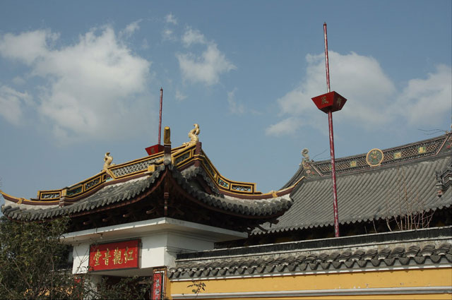 老汉挑选了上正梁的黄道吉日。那天真是好日子。晴空万里,湖平如镜。等到上好正梁时,突然,一条大鱼从昆承湖中跳出来并跃过了大梁,跌落到泥沙中,又是几个跳跃,回湖中去了。这条是什么鱼?来得突然,大家没看清,鱼跃这么高,大家更没有遇到。大家都很惊讶,认为是观音菩萨显灵了。等房子造好,老汉、老伴和众乡亲把观音菩萨请到了新建的房子里,因原竹筏上的小房子是红色的,这次房子也是用红色粉饰。众人就给这座新屋起名为红观音堂。观音菩萨微笑中带着慈祥,每天接受信徒们的顶礼膜拜。