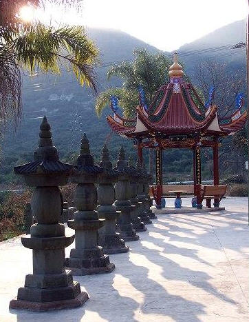 第四进叫观音阁,是前几年刚建起来的,观音阁的中央盛放着观音菩萨的像,这座像大约有十米左右,阁的两边是84尊大悲神,与观音菩萨像背对着的是一块刻有许许多多神仙像的石头,这块大石上大约刻有几百个神仙。