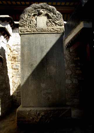 “关帝”是汉地道教将三国蜀汉大将关羽神化的崇拜偶像,与西藏信奉的教派毫无关系,为什么会有佛教圣地拉萨修建一座 关帝庙呢?关帝庙的大门里面有一块《磨盘山新建关帝庙碑》,记述了建庙缘起和过程。该石碑通高3.04米,宽1.18米,厚0.29米。碑额为二龙戏珠, 浮雕,图案中间阴文篆刻“万年不朽”4字。碑座为长方形,长1.35米。碑身正面四边饰有云霄纹,中间为汉字楷书碑文,文体工秀。碑文为:
