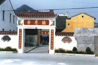 瑞应堂,旧名上庄庵,在南岳镇上庄村。坐北朝南。建于清道光十一年(1831)。原寺坐东朝西,仅三间小平房大殿,后倒塌。民国十年(19 21),地人邱步地、邱余直、吴圣进等九人为首重建。1958年公社化中衰落,寺宇倾圮。1998年,地方善信募缘十方,鸠工庀财,由居士李玉霞住持,将旧堂改向重建。建成大雄宝殿三间,单檐飞爪,中奉一佛两弟子,东立三眼佛,西坐陈十四圣母。再建东厢二楼四间,楼上坐佛,西厢二间二楼。老山门保留,现寺前移,再建山门一间。全寺占地770平方米。原住僧一众,清江人,已离走。现由村里邱志月管理。堂位村东首,外是田野,西紧靠邱氏宗祠,再西100米是甬台温高速公路。
