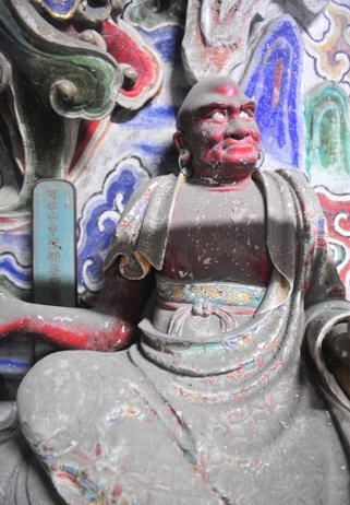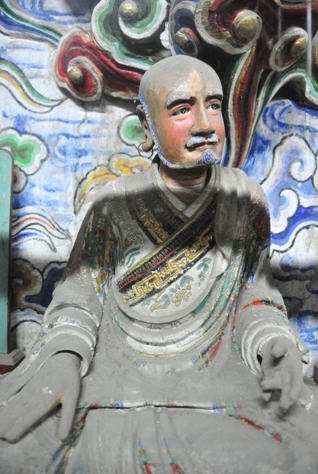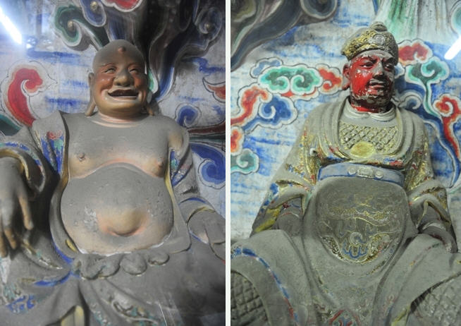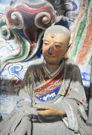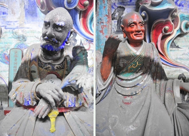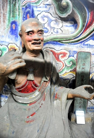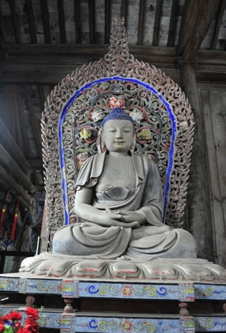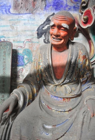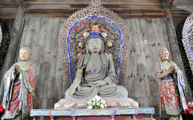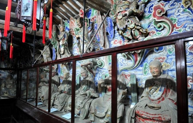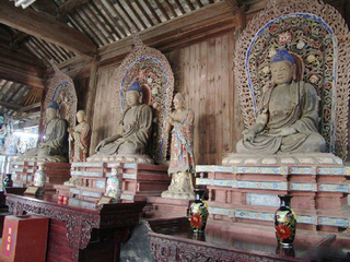 紫金庵大殿正面巍坐在覆莲座上的是释迦牟尼佛、药师佛和阿弥陀佛;迦叶和阿难侍立两旁;海岛观音壁立“三世佛”后;而各现妙相的十六罗汉分列于大殿两侧的佛龛内。