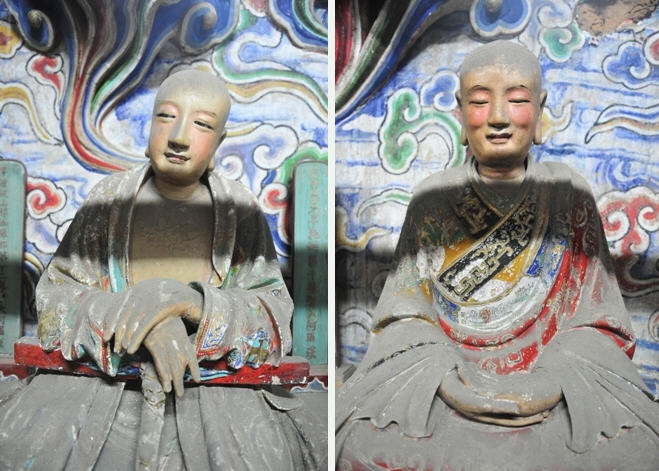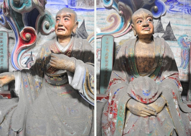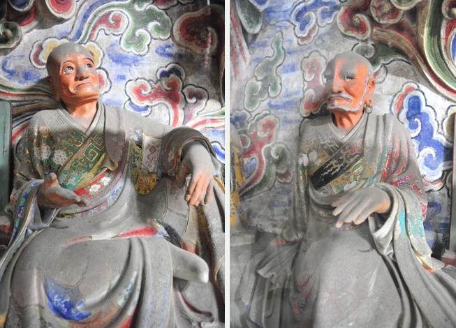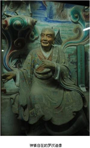 紫金庵罗汉塑像造型十分准确,形体比例适度,姿态生动,容貌各异。有的在凝想,有的在假寐,有的在讪笑,有的在愁思,各种姿态雕塑得惟妙惟肖,栩栩如生。“长眉”罗汉慈颜善目,满脸福相;“评酒”罗汉遍尝杜康,一副醉态;“伏虎”罗汉虽者态龙钟,然而却法力无边,只用手向老虎一招,那斑烂猛虎,竟如温柔小猫驯服在他的脚下舔袍角;而“抱膝”罗汉则傲气横溢,认为降伏一虎,只不过雕虫小技。右壁那3尊罗汉目光不约而同地注视柱头的蛟龙,只见“降龙”罗汉大眼圆睁,嘴唇紧闭,双脚脱鞋,放在座上,右手手掌向上,在做“请”蛟龙下来的姿势,左手则放在屈起的左膝上,神情威严自若,信心十足;一旁的“钦佩”罗汉,眼睛望着蛟龙,双手一摊,嘴一抿,对于“降龙”罗汉的法术不胜佩服之至;而“藐视”罗汉一旁翘着二郎腿,转过头去,一副不屑一顾的神情,但他那凹陷的眼睛却在窥视着柱头的蛟龙,看它是否真会被降伏,那心口异态的样子被表现得淋漓尽致。“听经”罗汉最为虔诚,他正专注一境听佛说法,而下彼此争斗生气。“沉思”罗汉别出神韵,他低垂着双目,凝视着下前方,似乎在思索着一个什么问题,想求得答案,这种深思沉想,专注探求的精神令人感佩。雕塑者虽然塑的是佛国罗汉,但充满世态人情,严然生活在世上人间。罗汉的服装层次分明,衣褶流转自然,表现出质感。800多年前的工匠将写实与传神巧妙地结合在一起,显示了12世纪中国雕塑艺术的高超水准。