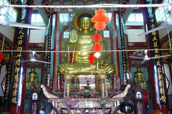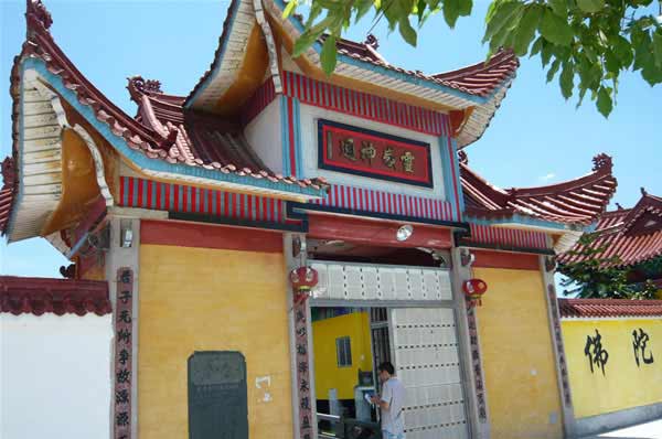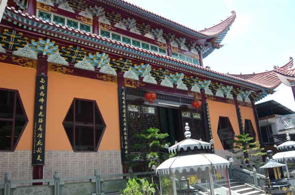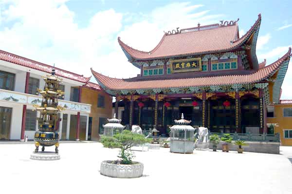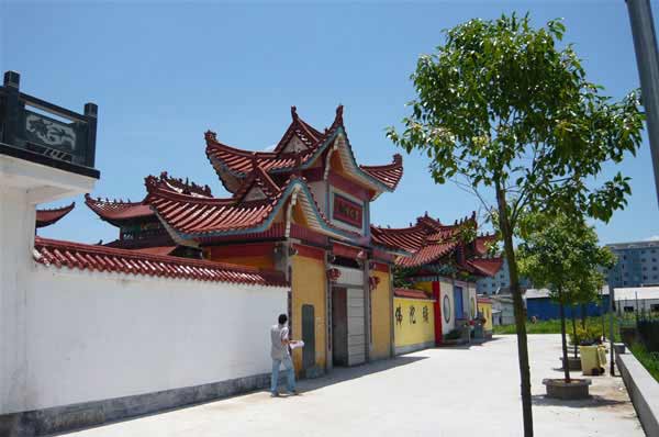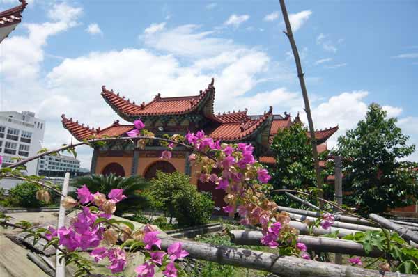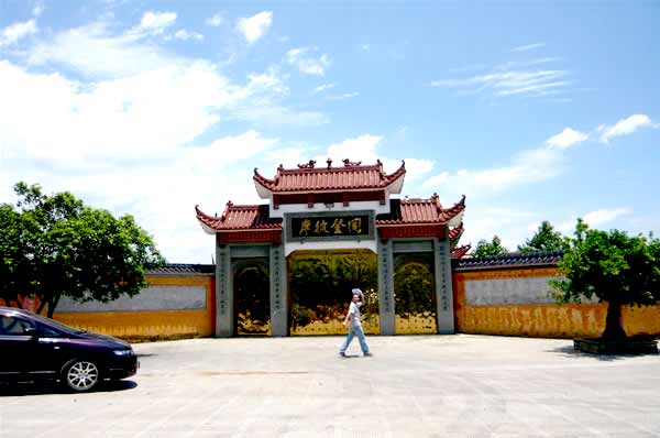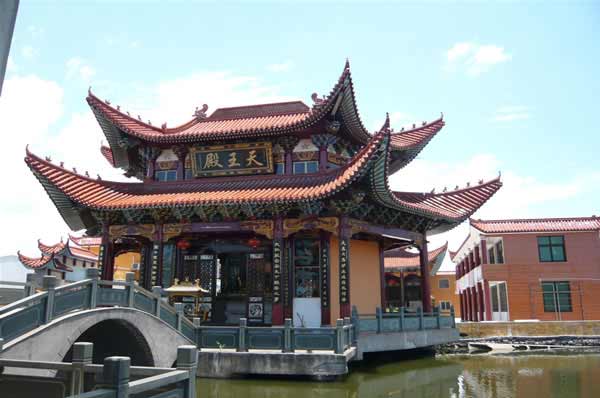 牌坊式圣门,面对东街。圣门有普陀山普济寺道生法师撰写的“同登彼岸”匾额,两侧石柱上有应景对联“福地内修身积善成千秋正果,胜景前培育李是一脉书香”。通过十多米的莲花青石走道,即是山门。一座长约8米的连环桥,横跨约200米的人造湖上,直贯第三进天王殿。大雄宝殿内释迦牟尼佛像高达5米,宝相庄严。