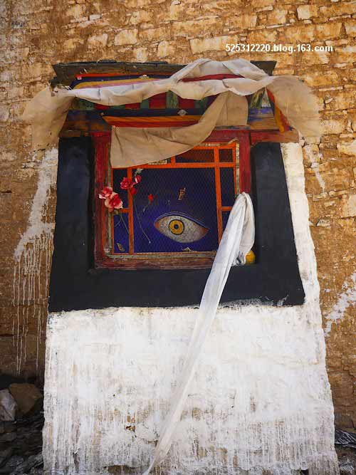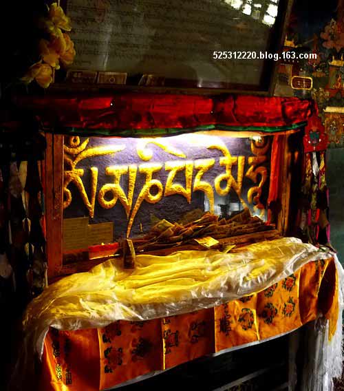 巨石南面坡下坐落着的“日松贡布”(怙主三尊殿),亦是帕邦喀的重要组成部分。历史上风经破坏,原物多毁,1980年群众自筹资金重修,塑像、 壁画均为近年新作。但历史悠久的怙主三尊(即密宗事部三怙主,为佛部之文殊、金刚部之金刚手、莲花部之观音)浮雕像和吞弥·桑布扎最早书写的“六字真言” (即唵、嘛、呢、叭、咪、吽)刻石幸存了下来。“六字真言”刻石现嵌于门廊外的右壁内,长1.22米、宽0.66米,六个藏文大字为减地浮雕阳文。怙主三 尊浮雕像即传为松赞干布时自显的“怙主三尊”,后经尼泊尔工匠雕刻而成。这三尊雕像与现流行的造像风格相去较远。观音像:头戴宝冠,高髻,髻顶一释迦佛的 头像,四臂,两臂合掌胸前,两臂置于左右,上身裸,披帛由两肩搭下;文殊像:与观音像略同,惟两臂交胸前持单茎莲花;金刚手像:较奇特,高髻,两蛇交缠额 上,三目怒睁,獠牙横龅,几乎全裸,披帛由肩搭下,遮于腹前,左臂高举金刚杵,右臂置于胸前,佛书说他“以智慧光普一切,气离三涂(指地狱、饿鬼、畜牲 ‘三恶趣’),得力无上,是故号此菩萨名大势至”。还说这三尊标志着“仁”、“智”、“勇”三德。怙主三尊雕刻较粗糙,属西藏早期作品。在日松贡布旁边的 一块石上有一只大眼,长在尺余,宽有数寸,炯炯有神。多少年来一直睁着眼睛,似乎在监视着每一个前来朝圣的香客和游人。据说这只石眼是过去一比丘旺秋钦布 的眼睛。他原是异教徒,后来同佛教高僧斗法,失败以后改奉佛法成为佛门弟子,取法名“德却”。他长有三只眼,这石上自显的大眼,乃是他的一只眼睛。