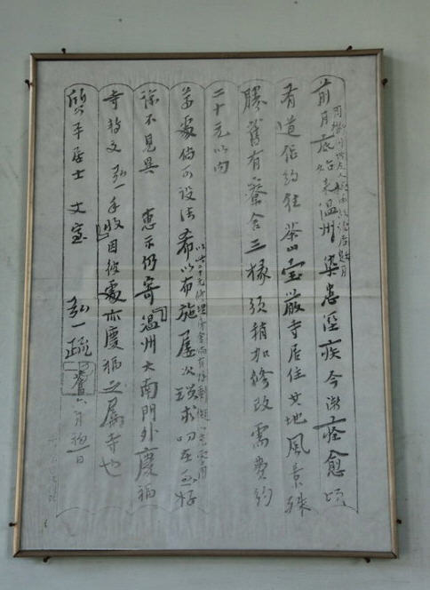 1932年,大师在温州时给刘质平及寄慈居士的信,其中 写有“今居乡间,付邮尤为不便“乞告彼云,朽人决定遁世埋名,居住无定所(不愿告人)”,可以探索出弘一法师曾在宝严 寺住了很长一段时间。弘一大师是近代文化史上的艺术先驱, 他在佛学、美育、绘画、音乐、戏剧、书法、金石、文学等方面都 有很高的成就,他的业绩对后学影响很大,著名音乐家刘质平,著名书画家丰子恺就是大师的高足。弘一大师在宝严寺住过,并为宝严寺化缘,为佛像装金,由衷地赞美宝严寺一带风景殊胜。这两件久不为人世所见的宝贵信函,为茶山宝严寺和徐岙、樟岙一带景区增加了不少文化内涵。