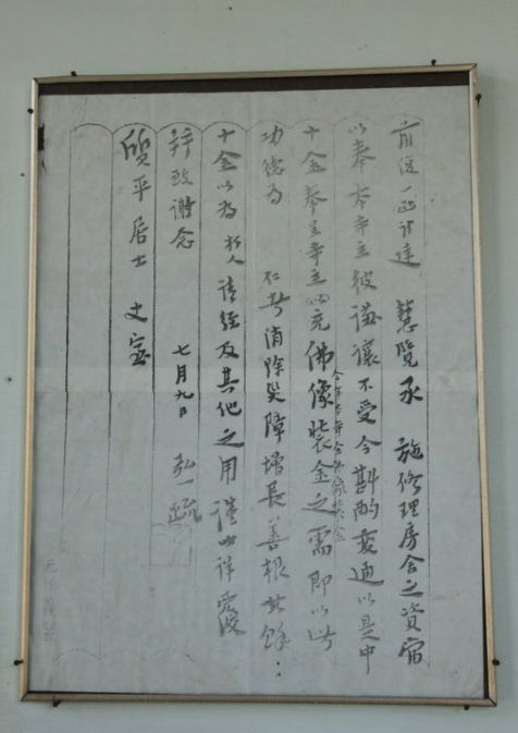 前复一函,计达慧览,承施修理房舍之资,当以奉本寺主, 彼谦让不受,今斟酌变通,以是十金奉呈寺主,充佛像装金之 需(今年本寺全佛像装金)。即以此功德为仁者消除灾障,增长善根。其余十金以为朽人请经及其他之用,谨此详复,并致谢意。