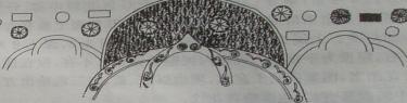 背面彩绘仅存上半部图案。中间残存泥塑背光一躯,为舟形项光及圆形身光组成,光环上塑出涡旋纹及云状纹饰,原似用色彩作过填描,局部凹处尚存红、绿色矿 物质原料痕迹。光背之上为半圆形的彩绘背屏,其上满绘菩提树叶,中间嵌描出两朵圆形单瓣花纹背屏的两侧画有单个的圆形莲花及圆形、长方形色块。背光左右两 侧及下方原绘有佛像数尊。大部分已被摧毁,仅辨靠上的两尊残存光背画痕,其佛像依稀可辨出右侧似为一菩萨像,头戴花冠身披飘带、天衣,手、臂皆佩钏、镯饰 物,项下饰缨络;左侧似为观音像,头戴高宝冠,身披天衣结跏趺座于莲台,手、臂皆佩饰钏、镯及插花等饰物。