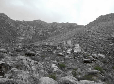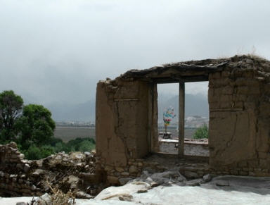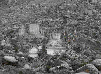 转过一道小山岗后上贡巴萨寺的遗址就一览无余,看的出当年鼎盛时期的规模和气势。据说当年曾经有四五百位僧人往来于上下贡巴萨之间。透过残破的古塔再往上看,高高的山脊上,缕缕簇簇的经幡间点缀着一点点白色的小茅棚,那是离世静修人们的简陋关房。