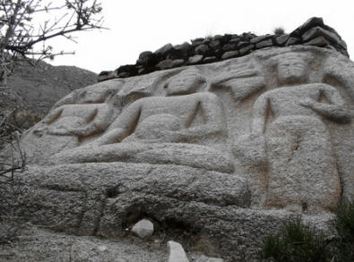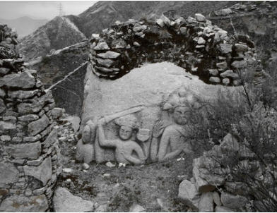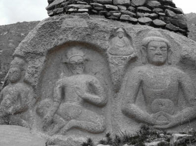 坐落在坡地上的下贡巴萨寺目前大部分 虽已经破损,个别完整的房子早已换成了世俗的主人,虽然从远处看,寺庙整体规模还算明显,只是往日里朗朗的诵经声变成了如今悠闲漫步在这块丰美水草上的畜 禽鸣吠。一股不小的清泉水从山坳里向下流淌,花花流水声宛如无数天女嬉笑。沿着杂草丛生但依然清晰的石板路沿路往上不远,许多雕刻精美的祖师及佛像就依次 引入眼帘。沿途中道路两边不时冒出一尊尊如此庄严但有几分荒凉的石刻佛像。值得欣慰的是大部分佛像完整无损。