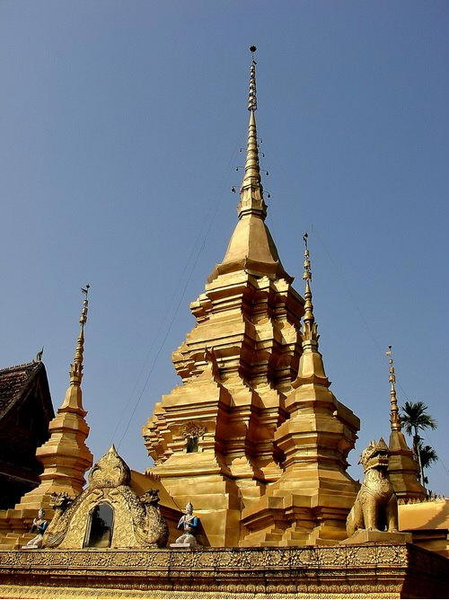 佛寺西北侧屹立着一座金身佛塔,称为曼春满金塔。5座佛塔共立于一个正方形基座上,塔尖有风铃杆,系有铜铃,风吹铜铃动,经常有悦耳的叮当声传出。5座佛塔全部涂有金粉,在阳光的照耀下,金光闪烁,令人眩目。漫步于佛塔、佛堂、佛舍的浑然一体间,一幅幅壁画奔来眼底:《召米爹转世》、《释迦牟尼的故事》佛教壁画,一个个优美动听的传说故事,令人百听不厌,回味无穷。