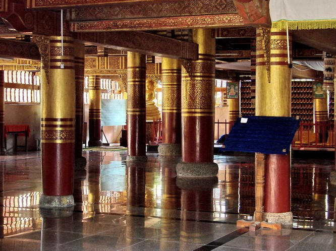 大殿正前方是一座多棱角佛坛,正中央供奉着一尊高4米多的释迦牟尼金身塑像,释迦牟尼金身塑像前并排供有5尊小佛。供奉佛像的佛坛四周,陈列着竹制的长矛、长鞭、刀剑等古代兵器,悬挂着无数长幡。殿内还设有几个坐坛,供拜佛的僧侣坐在上面诵经。