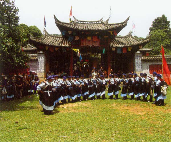 大殿院内,还有两棵古树云南樱花,植于1771年,可谓云南樱花之最。树干粗壮高大,倾斜交柯,枝条繁密错杂,盖满了整个大院。阳春三月,红花锦簇,与气宇轩昂的殿堂、金光闪烁的铜瓦、四周密密的松林、满山雪白的梨花交相辉映,构成一幅绚丽多彩的画面。节假日到此游玩、野餐者,络绎不绝。