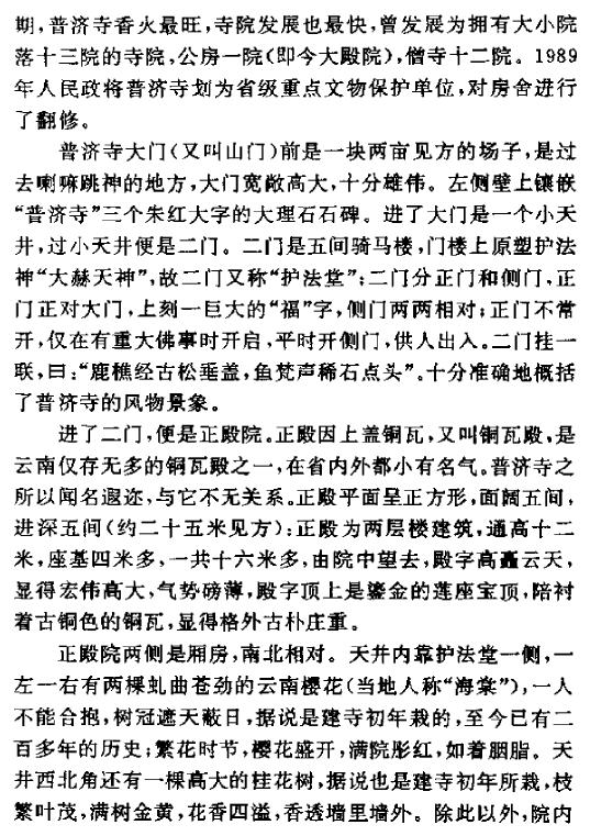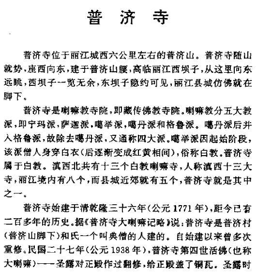 普济寺位于丽江县城西北6公里的普济山中,始建于清乾隆三十六年(1771年),为丽江城郊五大喇嘛寺之一,因大殿铺盖铜瓦而闻名遐迩。