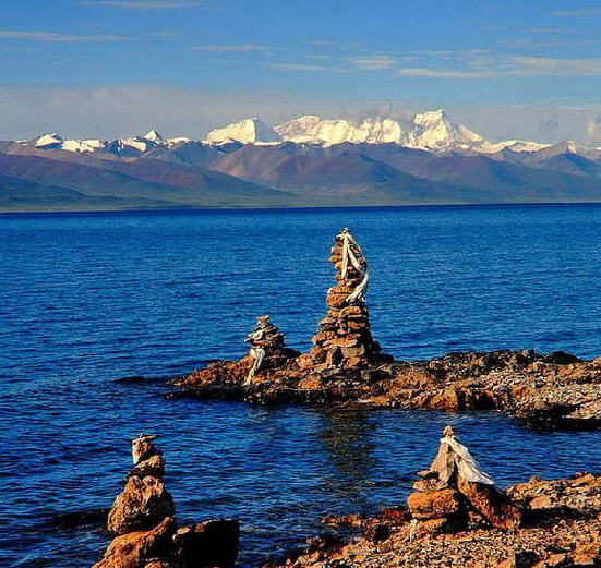 每个到过纳木措的人,整个灵魂都仿佛被纯净的湖水所洗涤。站在纳木措湖边,这世界上最高最美的神湖让人震撼,仿佛置身于一个蓝色的世界。淡蓝、 浅蓝、灰蓝、宝蓝、深蓝以及深邃如墨一样的蓝黑,这由浅而深的蓝色,蓝得清澈,蓝得丰润,蓝得迷人,似乎包容了世界上一切的蓝色。 头顶深邃而疏朗的蓝天,与纯净的湖水浑然一体;远处雄奇皑皑的雪峰犹如琼楼玉宇,忽隐忽现;湖边的草地犹如一张巨大的绿毯,无边无际。清晨,湖面雾霭 茫茫,太阳升起云消雾散,浩瀚无际的湖面在清风中泛起涟漪。在阳光下,念青唐古拉山的主峰格外清淅,如一个威武的战士守护着纳木湖。高原的气候常常瞬息万 变,时而狂风大作,时面乌云密布,风雪过后,湖面依然波光粼粼,透着一种别样情韵。