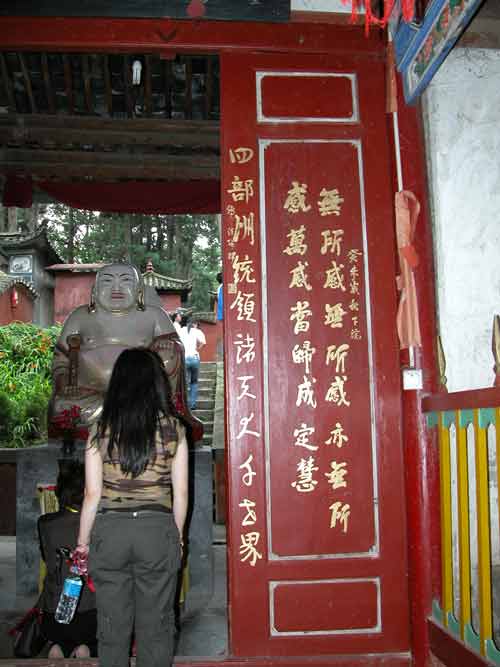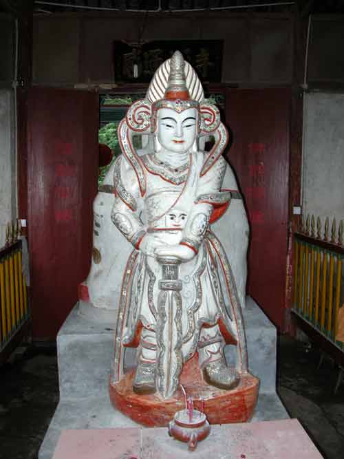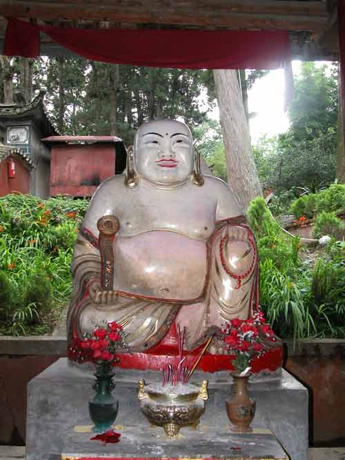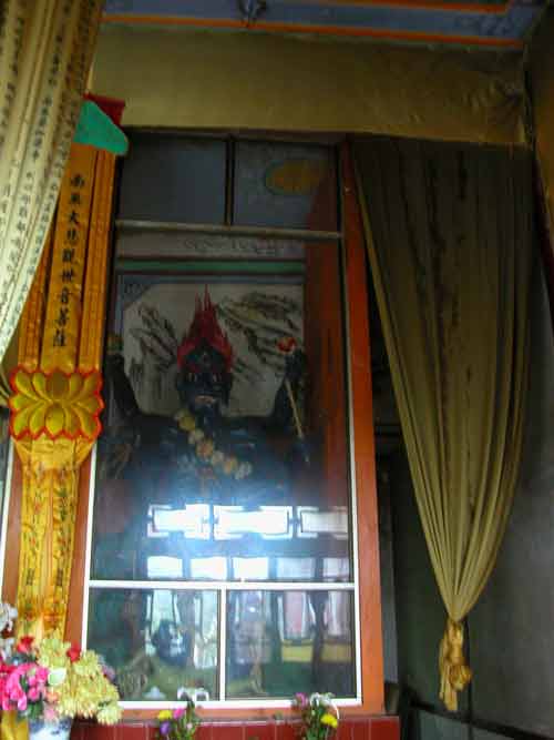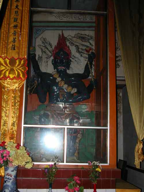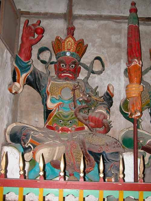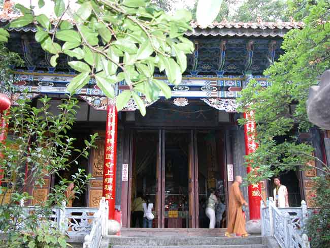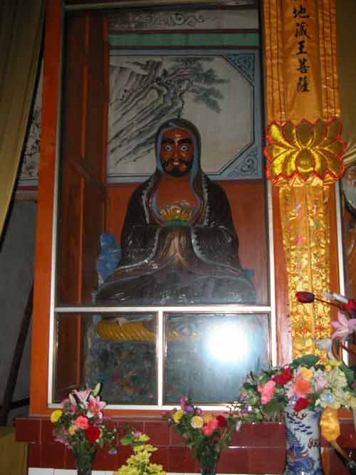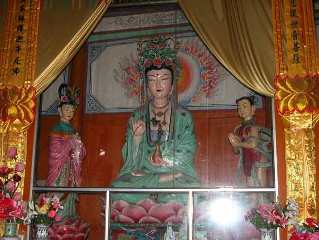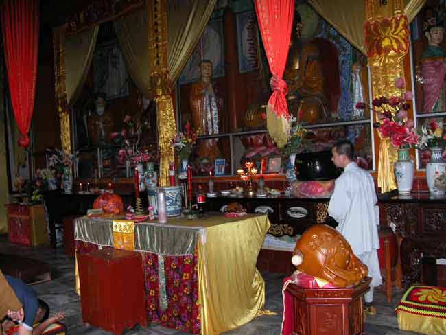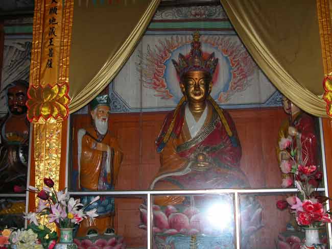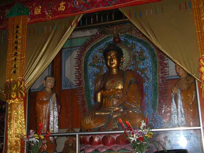大殿正中,供有丈八金身的释迦牟尼佛祖。佛像左边,是丈六金身的观世音菩萨。观世音两侧,是八尽金身的木叉和善财童子。佛像右边,是丈六金身的地藏王菩萨,再往右是丈六金身的达摩祖师。大殿内香烟缭绕,供果丰盛,佛灯长明,前来朝拜都络绎不绝。