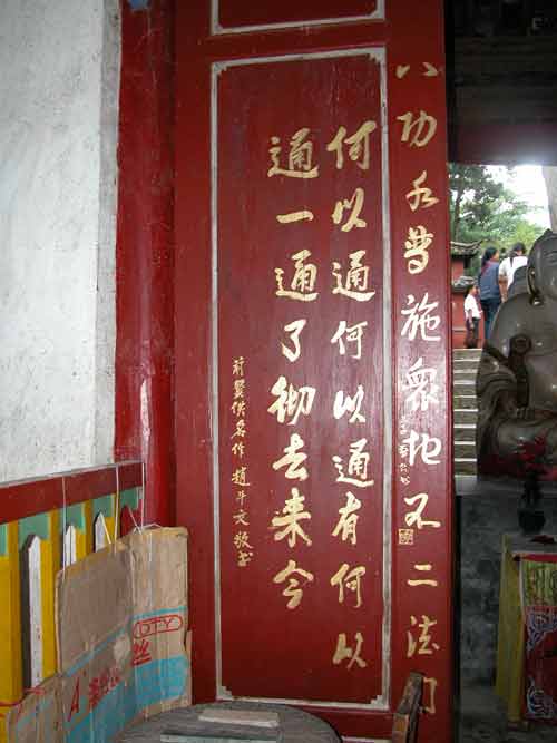 大殿前的朱红台柱上,有一对联道:“古刹何奇,状元写韵,才子参禅,总督题壁,霞客记游,名士名僧名官名流登临览胜;班山独秀,龙女献花,无极观帝,波罗正果,悲鸿好马,有文有赋有诗有画荟萃云堂。”这一对联把到过感通寺的状元杨慎、翰林李元阳、旅行家行霞客、和尚担当、画家徐悲鸿等与感通寺的历史和传说巧妙地连接了起来。
